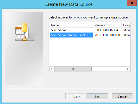 A new Create New Data Source dialog box will open. Select SQL Server Native Client 11.0 and click Finish.