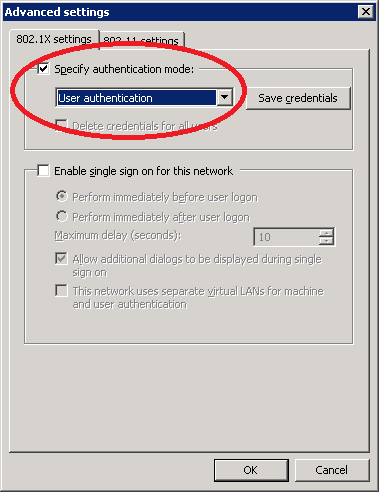 Select specify authentication mode and choose for user authentication. Click OK to continue.