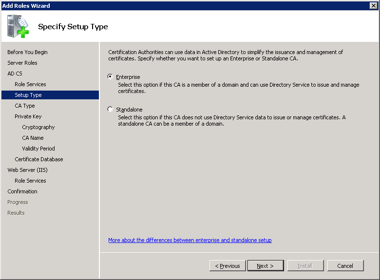 The certificate server can be part of the domain and use active directory or run as stand-alone. We want it to use the active directory so select Enterprise and click on Next.