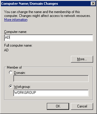 Here’s where you will enter the computer name. I’ll use “AD” (Active Directory). You don’t have to change the workgroup name as we’ll turn this computer into a domain controller in a minute. Make your changes and click on OK.