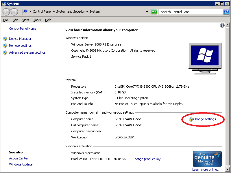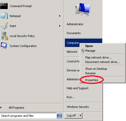 Click Start > Computer (right mouse click) > Properties.
