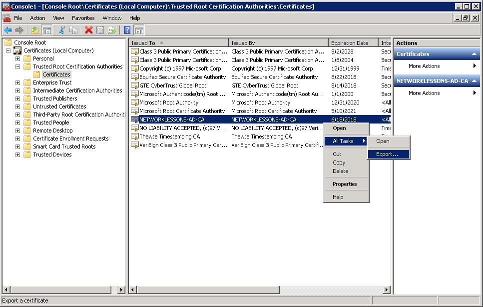 Select Certificates (Local Computer) > Trusted Root Certification Authorities > Certificates. On the right side you will your root CA. Select it, do a right mouse click and select All Tasks > Export.