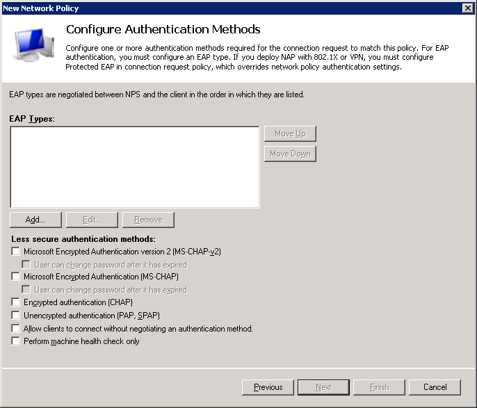 De-select all options in the following screen. We only want to allow PEAP and/or EAP-TLS.