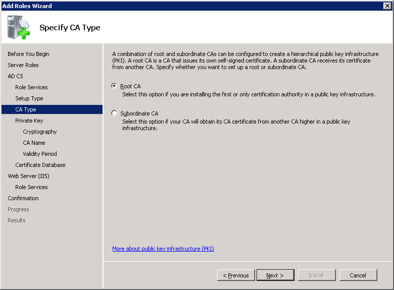 You can specify if you want this server to be a new Root CA or if you want it to be a Subordinate CA. Select Root CA and click on Next to continue.